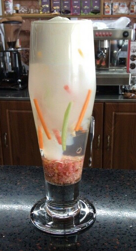 参赛作品创意说明乞力马扎罗的雪源于海明威的书名《乞力马扎罗的雪》,当看到这杯饮品的名字您一定会想到雪,是的我用了奶盖做雪来说这杯创意饮品的灵感,最初设计饮品的时候是直接把奶盖倒到饮品上后来感觉不对,虽然这样看起来很干净很舒服但我要的是每一杯饮品都是不同的都是一个新的未登峰,所以在加入奶盖前加入了冰块来突出冰山雪封的感觉。下面的四种果条分别是黄瓜条、西瓜条、哈密瓜条、胡萝卜条象征着万物顽强的生命力,在严寒下挑战着每个生命的极限。底部是这杯创意饮品的精髓跳跳糖和水晶果冻的结合来代表种子,每一个种子都是一种力量就像我们最初的梦想一样.........