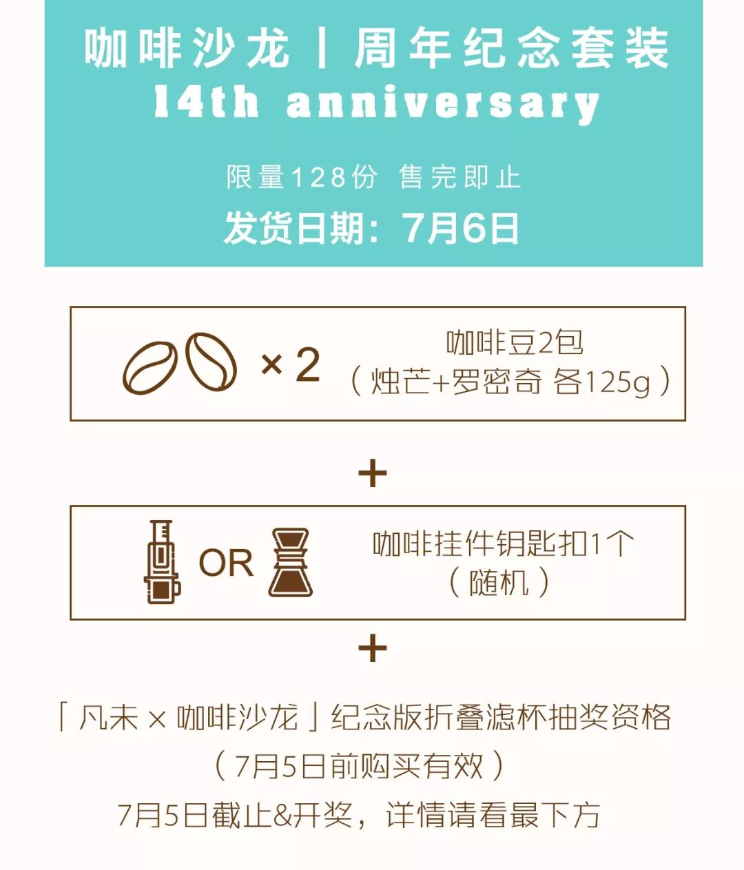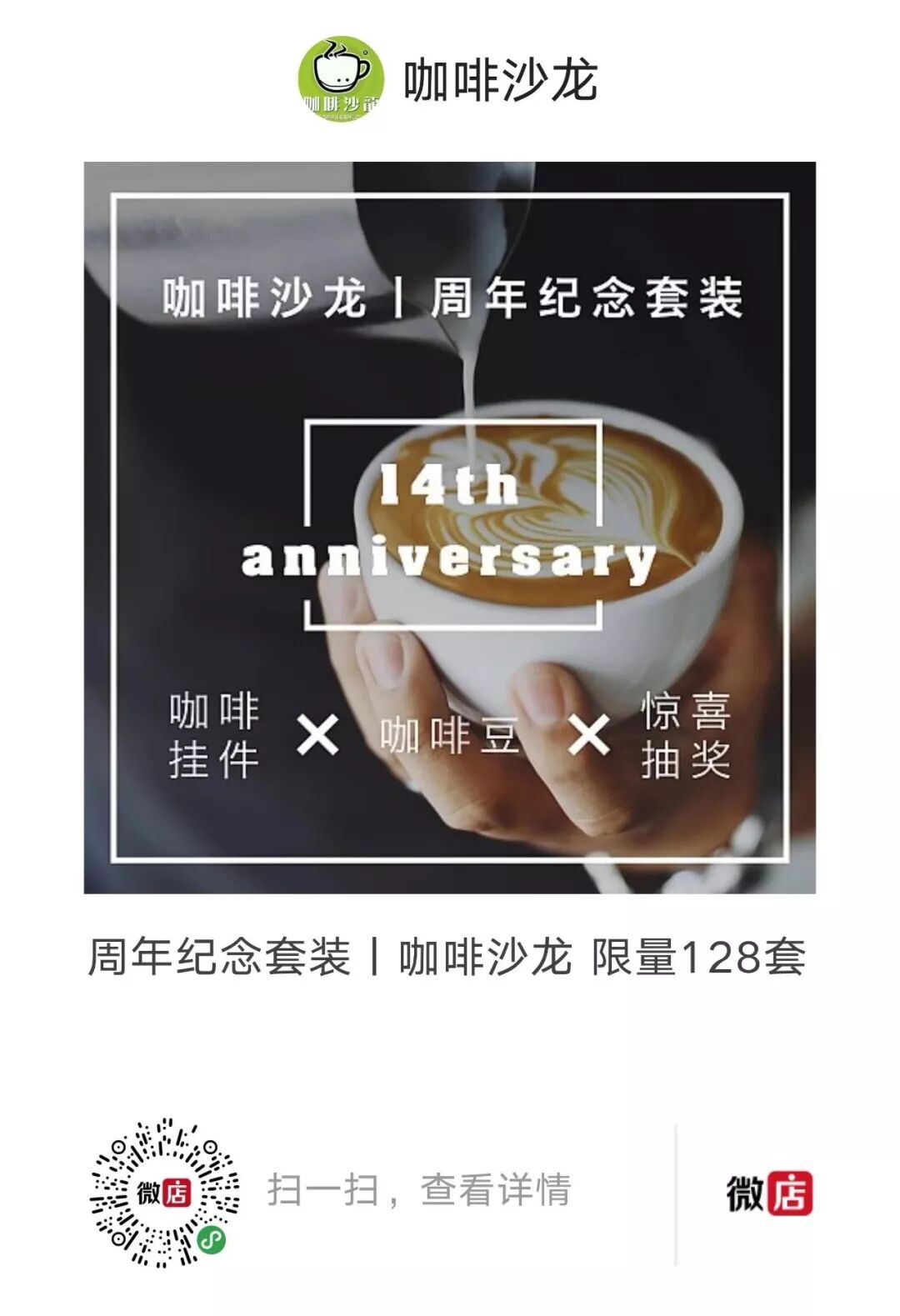 今天,2018年6月30日是咖啡沙龙的14岁生日我们与许许多多的朋友一起见证着咖啡的成长与发展14年来,咖啡沙龙也从最开始的咖啡论坛网站成长为一个咖啡类的全媒体平台希望能把咖啡融入生活专注于把咖啡的第一手资讯带给大家▲一分钟了解咖啡沙龙而在14周年之际咖啡沙龙特别为大家准备了一份〖周年纪念套装〗内含咖啡豆2包、咖啡挂件钥匙扣1个并可参与14周年福利抽奖