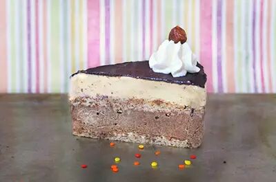 - 烤箱预加至675摄氏度。用电动搅拌器打发6个蛋清,1/4茶匙奶油,3/4杯糖和少许盐的混合物至非常浓稠有光泽为止。混入1杯半榛子继续搅拌均匀,按入烤盘做饼底,放入烤箱中烤3小时,静置至完全冷却后取出。对于巧克力冰淇淋层:在一个小锅里烧热1杯牛奶,沸腾前从火上移开并拌入5盎司巧克力,不断保持搅拌。5个蛋黄打散,在锅里加热巧克力牛奶,4杯糖和2杯鲜奶油,变热后倒入打散的蛋黄里,慢慢地不停搅拌。然后把糊状物倒回锅里,彻底混合均匀后放入冰激凌机。对于咖啡冰淇淋层:加热一杯牛奶,1杯鲜奶油,4杯糖,12杯咖啡豆和盐。然后在室温下放置约一个小时,注入咖啡。打散5个蛋黄,再加热咖啡混合物,然后倒入打散的蛋黄里,再将所有混合物都倒回锅内加热,搅拌至彻底混合后放入冰激凌机。将4盎司巧克力片和半杯鲜奶油加热融合,冷却至室温后浇在由饼底—巧克力冰淇淋层—咖啡冰淇淋层排布的冰激凌蛋糕上。香蕉烤榛子拿铁咖啡冰淇淋