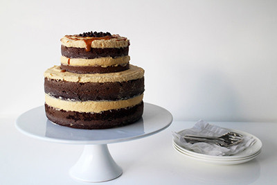 - 烤箱预热至160℃,将所有成分如3杯自发面粉,2杯糖,2茶匙香草精,3/4杯可可粉,2茶匙过筛苏打粉,200克黄油,1杯牛奶,3个大鸡蛋和1杯滚烫的咖啡在一个大碗中混合,搅拌约5-10分钟,直至所述成分充分混合且黄油被完全吸收。放入铺有烘焙纸的烤盘中,烘烤45分钟,烤熟后取出冷却。在一个大碗里用电动搅拌机搅拌 230克黄油,120毫升牛奶,1茶匙香草精和500克糖粉,直到充分混合后加1/4杯焦糖继续搅打充分。将焦糖奶油用橡皮刀均匀抹在蛋糕层上,放入冰箱冷藏,必须等第一层焦糖奶油冷却后才可以继续放上第二层可可蛋糕层。咖啡香草冰激凌