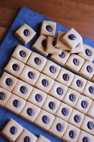 - 在一个大锅里中火加热397克炼乳,150毫升牛奶,115克黄油和450克糖,定期搅拌,直到糖融化。然后小火煮10到15分钟,持续搅拌,直到混合物浓稠。将混合物转移到一个碗里,加入2汤匙咖啡精华打约10分钟,直到焦糖色泽明显。然后放置室温冷却,切成方块后中心放一颗咖啡豆。咖啡焦糖焦糖布丁