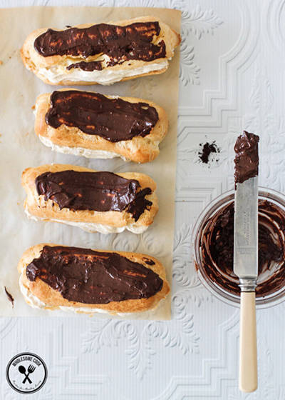 - 烤箱预热到220℃,在一个小锅里中火加热半杯水和2汤匙黄油,加入半杯面粉,用木勺快速搅动混合,直至混合物形成了一个球状。加入2个鸡蛋,用电动搅拌器搅拌,直到面团表面光滑有光泽。挤成圆柱状面团,放入烤箱在220℃下烘烤8分钟,放置5分钟后再取出。在此期间准备奶油馅,把3汤匙牛奶和40克巧克力在一个小碗里,微波加热20秒。再添加2汤匙糖,1/4茶匙香草,1茶匙现磨咖啡和1杯鲜奶油,搅拌均匀后存放在冰箱里备用。将考好的小饼切成两半注入奶油馅,表面涂抹一层巧克力酱。麦芽巧克力咖啡冰淇淋
