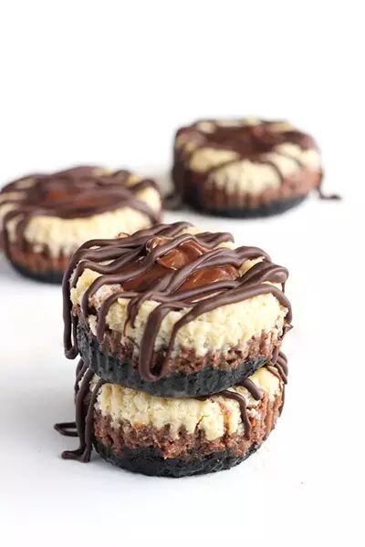 - 烤箱预热至176摄氏度,准备四个蛋糕衬,将半杯奥利奥屑,半茶匙咖啡渣和1汤匙黄油混合后按入蛋糕衬中作饼底,放入烤箱烤五分钟。在中型碗中混合4盎司奶油乳酪,3汤匙白糖,2汤匙希腊酸奶,2汤匙鸡蛋和半茶匙香草并搅打1.5分钟。将面糊分成两半,一半混合两汤匙的花生酱,另一半拌入1.5汤匙咖啡。依次向饼底上浇花生酱面糊,咖啡面糊,送入烤箱烤15到20分钟。取出后顶层中心添加花生酱,淋上巧克力花纹。焦糖咖啡巧克力