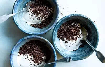 - 将在一个中型平底锅里中火将2盎司巧克力,2杯鲜奶油,2杯牛奶和2汤匙奶粉混合加热,在碗中打发12个蛋黄和3/4杯糖约2分钟,直到蓬松。慢慢加入半杯温热的奶油混合物并不断搅拌。然后倒回剩余半杯奶油混合物并不断搅拌,中火煮5到8分钟。静置5分钟后再次搅拌混合,将碗放入冰水中冷却后按照说明放入冰激凌机器中。烤箱预热至160摄氏度。在一个中型碗中混合了6汤匙黄油,3/4杯杏仁粉,1/3杯中筋面粉,1/3杯糖,1/4杯可可粉,1/4杯咖啡和1茶匙盐,搅拌至没有结块存在。将面糊抹匀在烤盘上,烤15到20分钟至考成咖啡屑。撒在做好的冰激凌上即可。花生酱冰咖啡迷你芝士