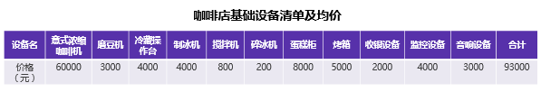 场地、设备和人是开一家咖啡馆的主要投入好的选址是咖啡馆成功的第一步,不过好位置通常不便宜。我们将选址定在北京朝阳区某核心商业街,该地段租金水平在30~35元/平方米/天。那么一间100平方米的商铺,每月租金需要大概10万元。选址完成后是购置设备和装修,这两项更多是初期一次性投资。装修费用根据风格和品质有所差异,通常一家咖啡店的装修成本在1500~2000元/平方米,若追求豪华奢装,价格更高。如此,一家100平米的咖啡店,基本装修费用就要15万~20万元。咖啡设备方面,基本配置包括咖啡机、磨豆机、冷藏操作台、制冰机、搅拌机、碎冰机;如果希望同时销售“咖啡+糕点”,则还需增加烤箱、电磁炉等。作为咖啡店的核心设备,一台进口的意式浓缩咖啡机的价格约在2万~12万元。咖啡机的价格浮动较大,差异主要在于设备稳定性,如稳压和水温的稳定性。