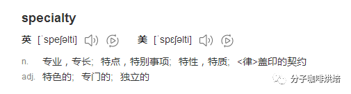 我们先来看看所谓“精品咖啡”咖啡的由来吧。精品咖啡(Specialty Coffee)作为一个专业名词,是由美国旧金山爱尔兰咖啡公司(B.C.Ireland)娥娜·努森(Erna Knustsen)的咖啡采购专家,基于专业认知,创造了[specialty coffee],此一新词。于1974年在美国《茶与咖啡月刊》(Tea& Coffee Trade Journal)上提出,即:「特别气候与地理条件下培育出的独特香味的咖啡豆」那么 Specialty 的英文的实际意义是什么呢?如图,字典君有话说