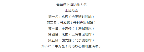 雀巢杯丨2017系列赛事 - 漳州站选手名单出炉 ! 2022-07-22 责任编辑:啡言食语 128 2017年赛事已经开战上海站、杭州站六强已诞生雀巢杯 杭州站 前6名第一名:卢强(上海麦隆咖啡)第二名:凌佳雨(绍兴BK咖啡馆)第三名:刘悦(北京漫咖啡)第四名:李光永(扬州兰憩咖啡吧)第五名:钟思含(温州如约咖啡)第六名:陈全威(青岛咖乐坊精品咖啡)祝贺的同时也祝愿接下来的选手比赛取得满意的成绩!漳州站选手名单已出炉!来寻找一下,有没有你的身影呢?(名单请往下看)奖杯会花落谁家呢~期待大家的表现比赛城市和时间安排上海(3月24日)前6名已经产生杭州(4月7日) 前6名已经产生漳州(5月26日) 报名停止成都(6月2日) 报名开始广州(6月9日) 北京站(6月26日Hotelex Beijing)梦想终点站总决赛(Hotelex Beijing)(6月27-28日)漳州站比赛时间5月26日漳州站比赛场地爵士金典咖啡福建省漳州市龙文区碧湖路碧湖公园A幢2楼让 你 的 咖 啡 梦 想 成 真2017雀巢杯拉花对抗赛漳州站名单❖ 小兮❖夏光辉❖叶榕杰❖谢超❖吴伟权❖翁伟勋❖吴涛❖王鑫文❖王柯毅❖汪顺❖王俊❖石妙婉❖苏天树❖圈圈❖卢小强❖刘代杭❖刘弋涵❖林世豪❖康嘉凝❖黄凯❖康哲铭❖李景峰❖赖国城❖梁凡❖林慧❖林敏杰❖江申❖胡晓洁❖黄达华❖郭磊❖洪佳明❖陈鸿铭❖陈量❖崔成林❖高宝水❖桂超锋❖陈言妹❖冯田田❖ 吴伟权❖ 郑礼腾❖ 余秋宜❖ 郑伟成❖ 钟淑轩❖叶亚洲❖ 周俊武❖ 周晶瑾❖ 蔡少伟❖ 曹宗亮❖ 侯捷❖ 李东❖ 郑元华❖ 彭陆生分赛区奖品第一名2,000 + 赞助商礼物第二名1,000+ 赞助商礼物第三名500+ 赞助商礼物特别声明:所有“雀巢杯”拉花对抗赛分赛比赛的前六名选手都可以来参加总决赛!本次“雀巢杯”拉花对抗赛指定用品和赞助商:冠名赞助 + 全程牛奶赞助咖啡机赞助磨豆机赞助特别鸣谢所有赞助商