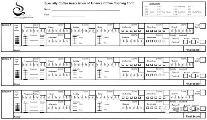 ⑥有机酸、烘焙样品辨认、熟豆辨认基本上算是考试中比较容易的科目。大部分应该都可以通过。有机酸听着玄乎,实际上只要对酸度敏感,能分辨出哪杯里加入了酸,基本就可以通过,如果能写对到底是苹果酸、柠檬酸还是磷酸、醋酸就可以加分。烘焙样品辨认,主要是了解SCAA对于适合杯测的咖啡烘焙度的规定,对于58、63那些色谱数值了解清楚是什么意思基本就可以通过了。熟豆辨认,就是去找100克熟豆样品中是否有QUAKER豆,根据SCAA规定,100克熟豆样品中如果有1颗QUAKER就不算做是精品咖啡。对于QUAKER,是要颜色真的是明显浅很多才能算,稍微浅一点,但是也进行了焦糖化反应,就不能算QUAKER。 ⑦关于杯测的5门,考试的要求也是这样,对于5轮,每轮6组咖啡,分别按照SCAA标准打分,所打分数要接近该咖啡的标准分数。而且每轮中6组咖啡的好坏趋势要正确,6组咖啡有的好有的差,精品非精品要分辨清楚。 每轮的考试,讲师都会先拿一支咖啡出来进行打分校正,分项去统计所有人的分数和讲师的分数。确定这杯校正咖啡的分数。在正式考试中,校正的咖啡,也会是那6组咖啡中的1组,但不会告诉考生是哪1组,看考生再次给该咖啡打分是否能够跟校正的标准能够符合。