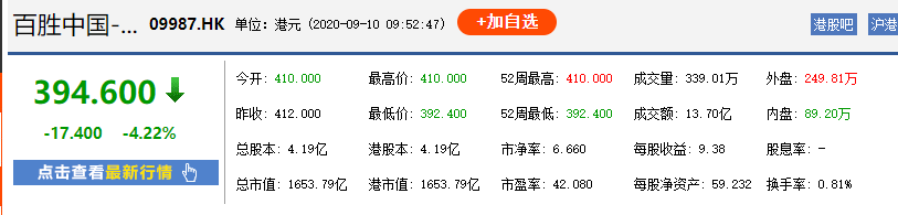 据了解,百胜中国IPO发行价为412港元/股。招股书显示,所募资金将会被用于资金将用于扩张及深化餐厅网络,投资数字化及供应链、食品创新及运营资金等。值得关注的是,该公司开盘第一天就下跌了,截至收盘下跌5.29%,报390.2港元/股,这是连锁餐饮百胜中国(纽交所股票代号:YUMC)的二次上市,而此次的上市也意味着百胜中国实现了美股和港股的双地上市。作为国内最大的餐饮企业,自2016年从Yum! Brands(百胜餐饮集团)分拆后,百胜中国已在纽交所上市四年。此前已经介绍过,百胜中国全称为百胜中国控股有限公司,成立于1987年,致力于成为全球最创新的餐饮先锋,旗下拥有肯德基、必胜客、塔可贝尔、东方既白、小肥羊、黄记煌和COFFii & JOY等。