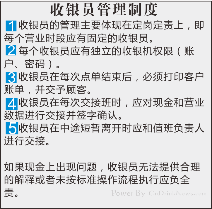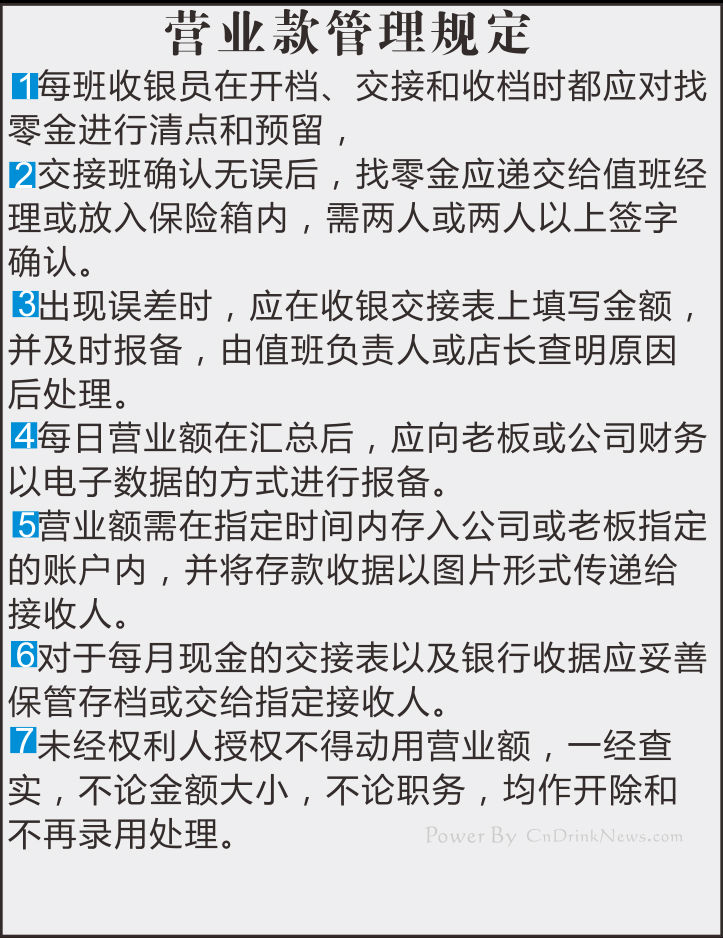 中国的外带饮品店大多数商品交易方式仍然以现金为唯一途径,现金管理在门店的财务管理中就显得尤为重要。一套完整的现金管理制度包括:收银员管理制度、营业款管理、营运备用金管理、培训。