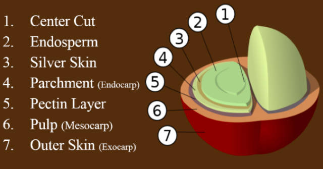 咖啡知识 | 咖啡果实的结构及处理法特点 2022-08-05 责任编辑: 631 每日精品咖啡文化杂志饮品界网平时我们看到的咖啡生豆是咖啡果采摘后经过一系列处理后才成为我们所说的咖啡生豆,那「咖啡果的构造」是怎么组成的。咖啡果和咖啡生豆的构造咖啡果由外到内可以分为七个方面,依次是:❼ 果皮 (外果皮)❻ 果肉 (中果皮)❺ 果胶❹ 羊皮纸 (内果皮)❸ 银皮 (羊皮纸与生豆中间的薄薄的一层,包括中线夹线部分)❷ 咖啡生豆 (胚乳)❶ 中线《你不懂咖啡》一书曾介绍,咖啡果实成熟的过程,就是颜色变红的过程。根据栽种环境和品种的不同,收获时咖啡果的大小也不同,比如阿拉比卡种,果实会有1.5- 2cm的大小,横截面直径会在1- 1.5cm,而如果是卡内弗拉种的果实要比阿拉卡比种的小一些。另外,咖啡豆的基本上都是来两个一起对着生长的,各呈扁形半球状,然而受到前述因素影响,部份的果实在成熟时会变型,所以咖啡豆会有一面是平的,平面的咖啡豆称为“平豆”,只有单一豆子,这种椭圆形的单一豆被称为圆豆Peaberry,但这种咖啡豆的书数量稀少。值得注意的是,因为果皮和果胶是很难直接从咖啡豆上去除的,所以出现了很多不同的处理方法,其中包括日晒处理、水洗处理、蜜处理,而每种处理法对咖啡豆的品质和风味有较大的影响。不同处理法咖啡豆● 日晒法:酸质较低、甜度较明显、干净度略低;日晒的咖啡口感较为甘醇,大多拥有成熟水果风味(如蓝莓、草莓、热带水果等)或酒香味。● 水洗法:酸质较明显、干净度较好、生豆品质最一致;如水洗埃塞俄比亚和肯尼亚拥有极为干净的风味,咖啡通常带有明亮的酸味与果香。● 蜜处理或巴西去皮留黏质处理法(PN)处理:酸质中度、甜度比水洗法好、干净度比日晒法好。免责声明:本文部分图片来源网络,网站部分内容如图片、我们会尊重原作版权注明出处,但因数量庞大,会有个别图文未来得及注明,请见谅。若原作者有任何争议均可与网站联系处理,一旦核实我们将立即纠正,由“饮品界网”整理编辑,转载请注明,本文意在传播咖啡文化,若侵权请告知删除,谢谢~!