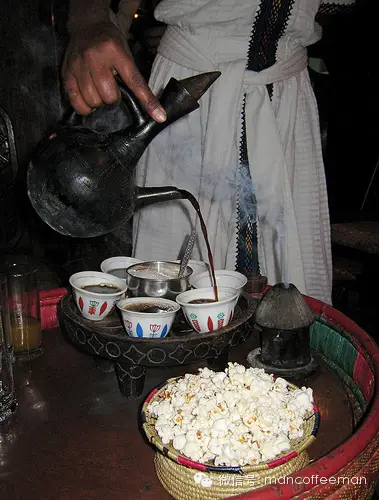 埃塞俄比亚人至今仍保持着很多咖啡传统。他们不习惯于去树上采摘果实,更多的时候他们收集咖啡树下熟透跌落的果子,这让咖啡的品质多少有些受损。他们一直采用传统的日晒法处理咖啡豆,而很少采用水洗法——这让咖啡豆更多地吸收了果肉的芳香物质,因此果香味较重。如今这些方法随着咖啡工业的发展,有些已经有所改变,但他们喝咖啡的方式却依然遵循古法。此法程序复杂,动辄要花上几个小时的时间才能喝上一杯咖啡。但此法煮咖啡,满室生香,令得你未喝先酔。