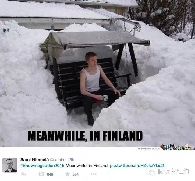 前几天,朋友圈和微博里,都传遍了假装在纽约大神的“芬兰人民冷冷地看着纽约人民唧唧歪歪谈大雪”的帖子,想必大家都看了吧?美国东部的暴风雪,被普通/文艺/2叉(为主)的美国人民都玩坏了,各种得瑟,结果最后被一个芬兰网友的帖子轻易摧毁了。