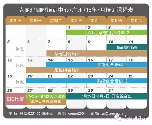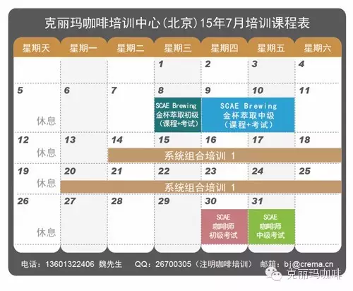 常规系统组合课程7月14-25日开办组合课程 为期11天(4800元/人),学员可只参与前8天的系统课程,收费3500元/人人数限定:每班6人国际认证课程7月8-10日SCAE金杯萃取认证课程(初级+中级)7月30-31日SCAE咖啡师认证课程(初级+中级)注:学员完成系统培训后,可自愿参加SCAE欧洲咖啡协会咖啡师认证考试,往届培训学员也可参加。培训地址:北京市朝阳区外馆东街23号院北京教育考试指导中心5号楼2单元602咨询方式: 13601322406 魏先生QQ:26700305(注明咖啡培训)克丽玛咖啡培训微信服务号“crema2005”,每月4次为你送上精彩咖啡资讯及最新咖啡培训课