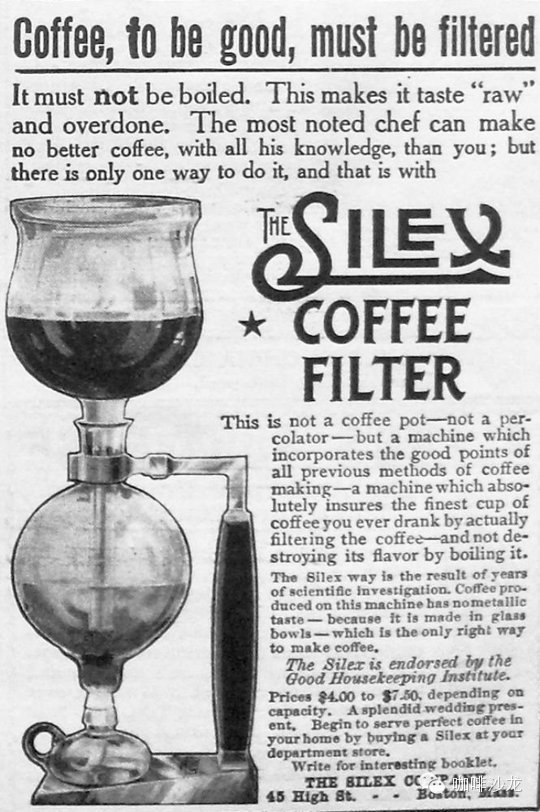 喜剧性的煮咖啡方式玩虹吸咖啡壶的人会告诉你很多关于那个时期的历史。他是一个具有实用性的美丽的工艺品,而且在那个时期咖啡还是很不流行的东西,而这个装置不是用来在厨房煮咖啡的。而是应该在客人来的时候,用来炫耀你的煮咖啡过程。这个虹吸咖啡的出现在今天看来是必然的。书本“这个咖啡的蓝瓶手艺”的作家说到这个是所有冲煮方法里面最具戏剧性的。而且他们应该知道,蓝瓶这个词是给虹吸咖啡专用的。在美国,虹吸咖啡变得流行多亏牌子Silex,这是一个用耐热玻璃制造的虹吸壶公司。他们的推广,把这个冲煮方法变得很流行,而且操作很简易,关键是家里也能出品很好的咖啡。