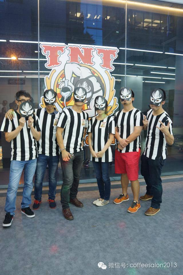 这个比赛陆续登陆亚洲地区。包括日本(TNTJP)、韩国(TNTKOREA)及台湾(TNTTW)。当晚Coffee Pro现场布置得像个“咖啡嘉年华”比赛规则是以“擂台”对决赛形式,所以中央位置有摆放形象公仔“面罩壮汉”任由来宾拍照。
