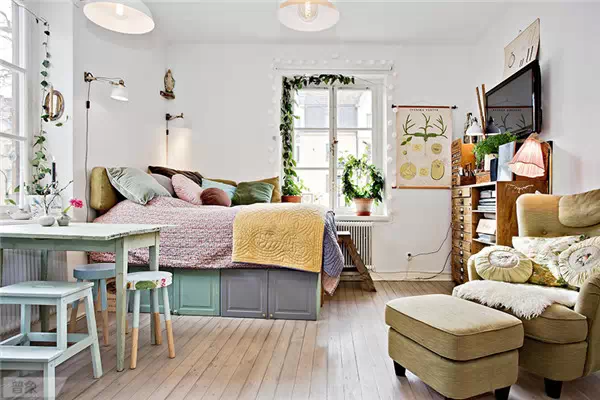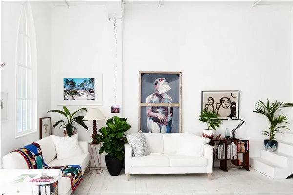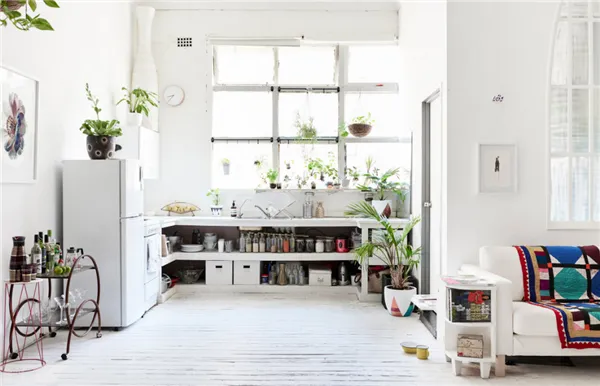 公寓的前身为巧克力工厂,屋主在搬进去的时候,第一件事就是将整个空间漆成全白的颜色,从墙面、天花板到地板,洁白的色彩点亮了整个环境,瞬间创造出现代的简约风,又揉和了建筑物本身所存在的复古质感。由于这个房子没有户外空间,所以她使用各种绿色盆栽填满冷冽的白,为家里带了盎然的生气。NO.3 超适合春天的花心公寓
