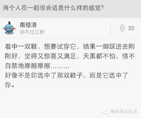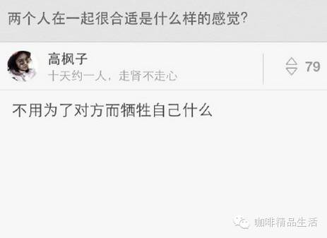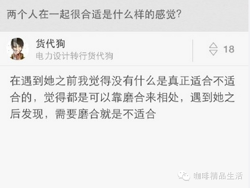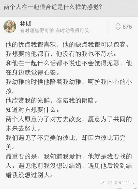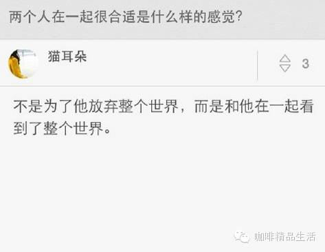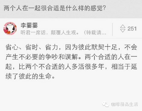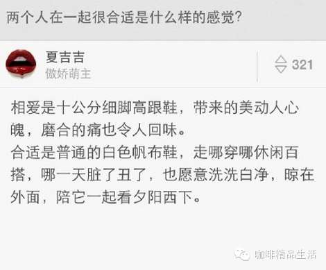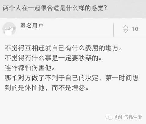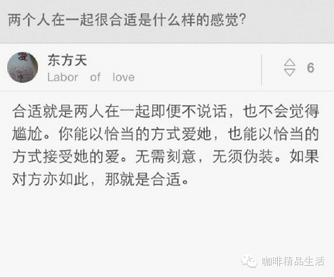 两个人在一起很合适是什么样的感觉? 2022-08-30 责任编辑: 89 爱咖啡,让我们聚在一起。与阿啡分享咖啡乐趣,请加微信个人号:acoffee520,随时交流,乐在分享。【两个人在一起很合适是什么样的感觉?】不用成为更好的人,做自己就和你很默契。你们真傻,一定是刚恋爱的人说的这些话,哪里有十全十美刚刚好的事如果觉得本文不错,请分享到朋友圈;爱咖啡的人,都在关注“咖啡精品生活”。