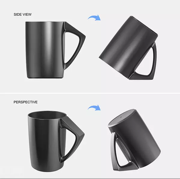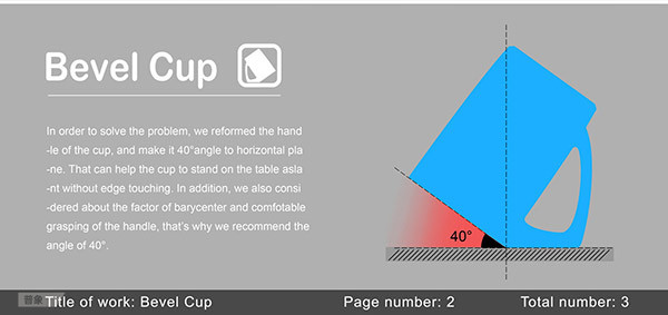 套杯中的巧克力经过加热后,会在短时间内融化。将爽口的水果放入杯内,就可为它裹上一层浓郁的巧克力酱。轻松在冬日享受火锅温暖的同时,品尝巧克力的丝滑和水果融合的奇妙口感。NO2.倾斜杯子(bevel cup)这款是来自中国美术学院高凤麟老师(微客设计机构创办人、主设计师)的倾斜杯,通过一个小改变,解决了挥之不去的卫生问题:杯口朝上则会进入尘土;杯口朝下则会弄脏杯口。这个设计还获得2012年的红点奖。