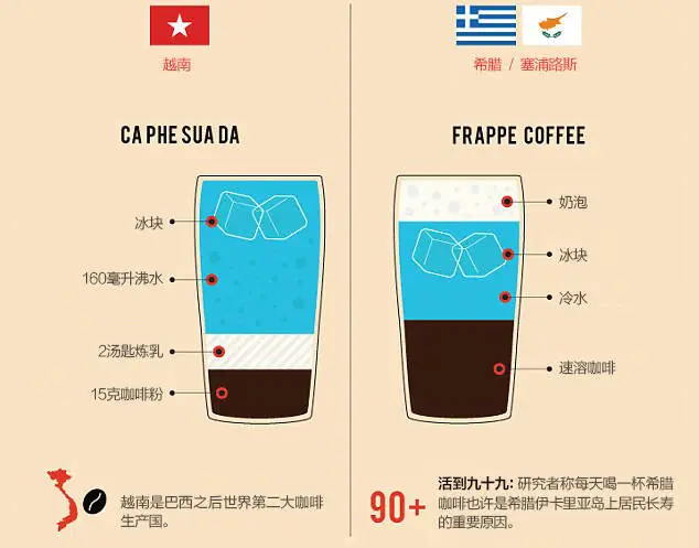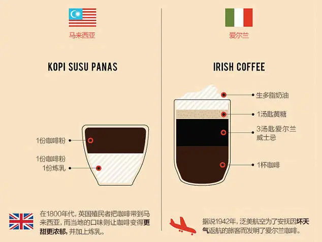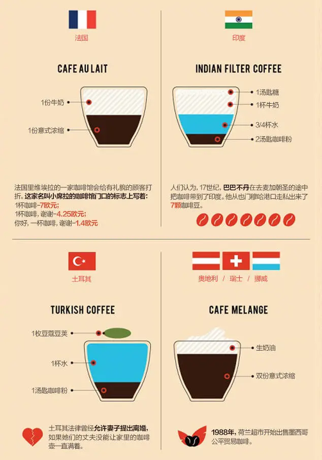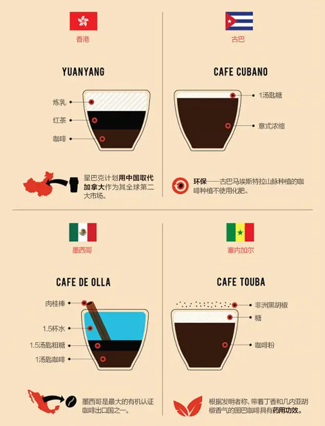 香港的鸳鸯咖啡融合了红茶和咖啡,让咖啡因发挥出最大的效果,这听起来是不是有些过头了?墨西哥的Cafe de olla由桂皮棒、水和咖啡调成,看着还不错。(以上图文源于网络,感谢分享)