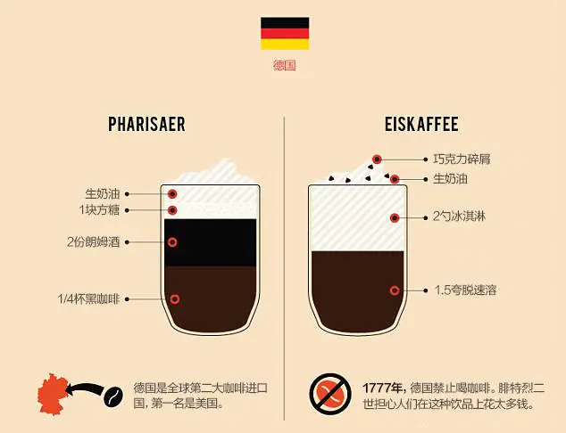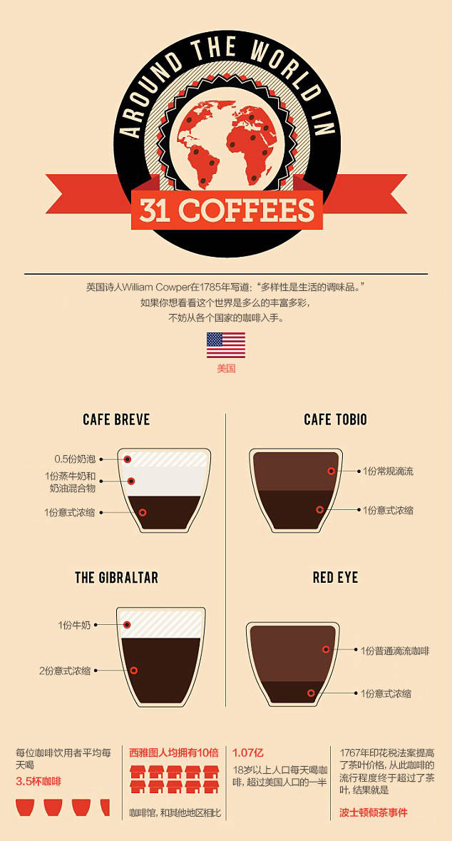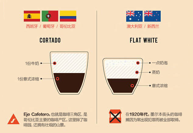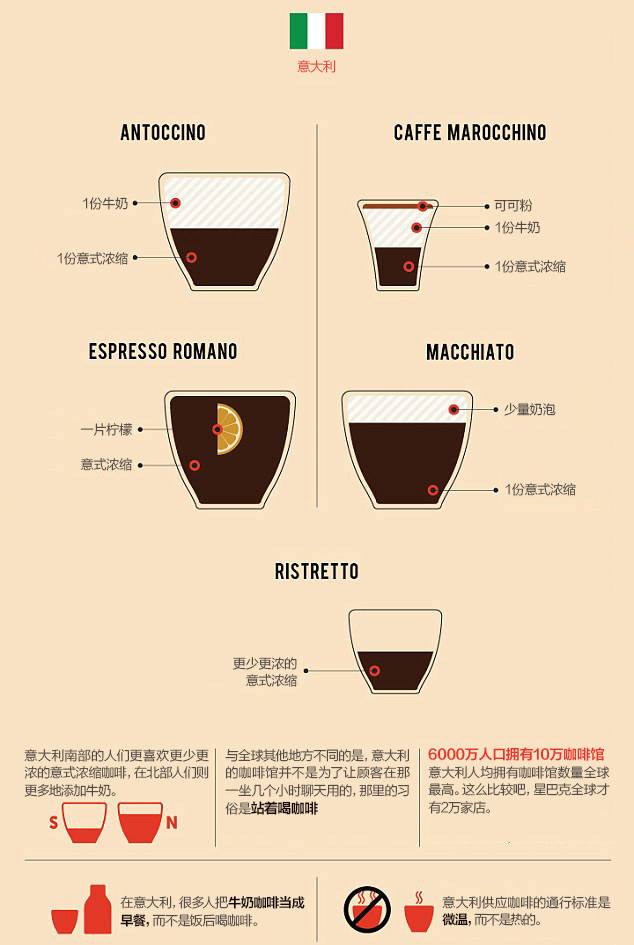 爱咖啡,让我们聚在一起。与阿啡分享咖啡乐趣,请加微信个人号:acoffee520,随时交流,乐在分享。出了国,还想喝咖啡,先要有点心理准备,即使是叫同样的名字,那咖啡的成分配比也有可能相差十万八千里!如果你不太了解这其中的差别,最后只能妥协:给我来个热乎的、带咖啡因的、能喝的,就成了。一个英国的旅行网站,将全球31种常见咖啡的名称和成分配比直白地用图呈现给你,这下子,你可以不用总是说“来杯美式”了。❤强烈建议为了眼睛,将手机横过来读图上文字
