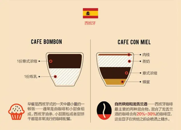 这个是西班牙的美味选择,西班牙可是Cafe con Miel(加蜂蜜的咖啡)的发源地。Cafe con Miel由浓咖啡、蜂蜜、蒸牛奶和桂皮末儿制成,喝这个相当醒神,这可是一大盘西班牙传统小吃吉事果(churros)都达不到的效果。