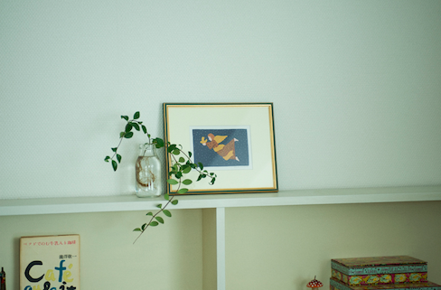 柳泽家中的书架是自己设计并请建筑公司制作的。书架上摆放了各处搜集而来物品,其中有一幅和田诚的原画。「将喜欢的东西一点一点收集起来,是件很开心的事情。在每一天的生活中,使用并且珍惜心爱的物品,时间也会变得丰裕起来。」