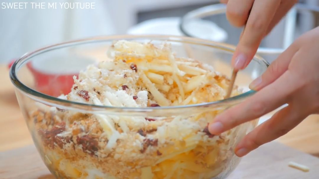 ⑥向苹果细条里加入白砂糖、面包屑、肉桂粉、核桃碎、蔓越莓干,搅拌均匀