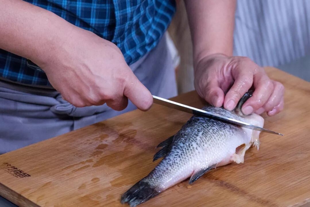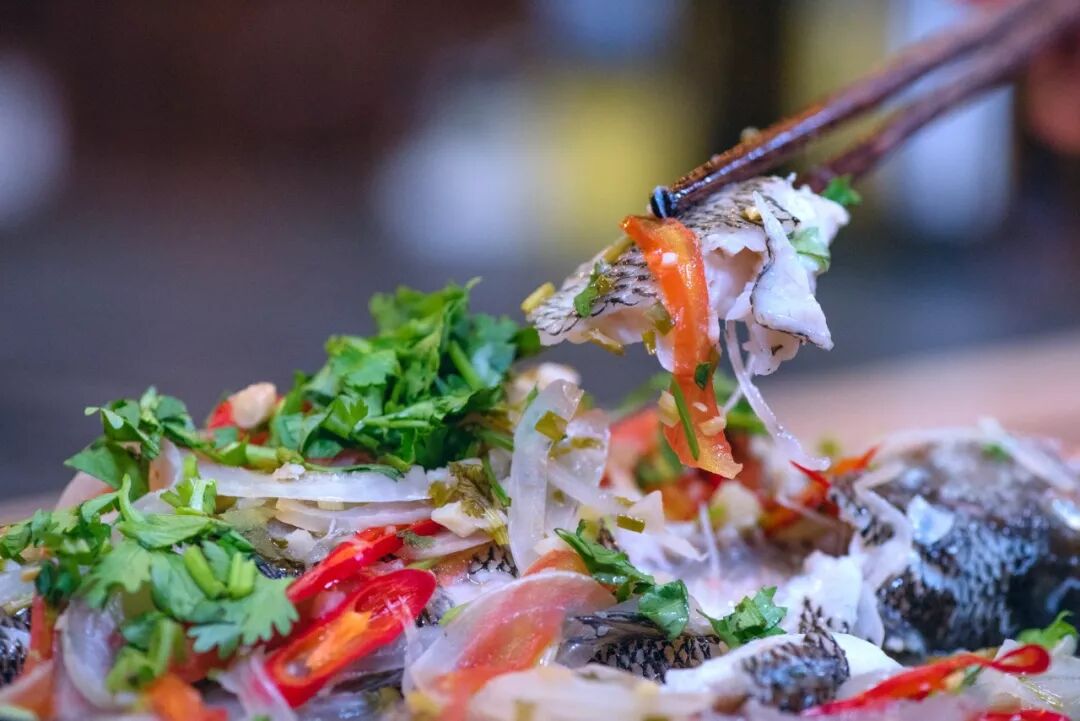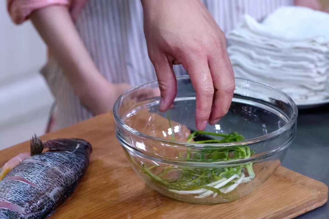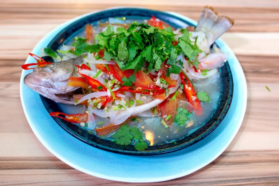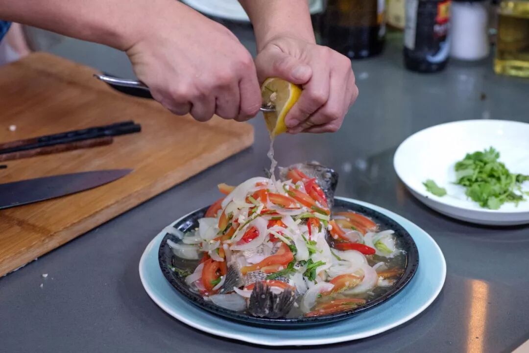 詹姆士的厨房丨这一定是夏天令你胃口大开的最佳料理~ 2023-02-07 责任编辑:厨房小跟班 292 酸甜苦辣咸就犹如人生五味一般,都各具特点。那怎么才能在烹饪的过程中把酸甜苦辣咸很好的结合呢?今天就以“酸”为代表,做一道经典泰式料理——泰式柠檬鱼,看看热带国家的人是怎样做开胃菜的吧!蒸锅、水晶碗盐 适量葱 4根清酒 适量鲈鱼 1条番茄 1颗洋葱 1/4颗香菜 2株柠檬 1颗鱼露 适量蒜末 1匙红辣椒 1根cription-url="https://mmbiz.qpic.cn/mmbiz_gif/2zxaP93End06WNgGYddfLoBLVicSCSXSFt7oDQV7VaZel7IN6Rdfvf9NiagdG6EevL3sAjRYkhdUcpEqtsLib2GdA/0?wx_fmt.gif" data-copyright="0" data-ratio="0.5592592592592592" src="https://mmbiz.qpic.cn/mmbiz_gif/2zxaP93End06WNgGYddfLoBLVicSCSXSFt7oDQV7VaZel7IN6Rdfvf9NiagdG6EevL3sAjRYkhdUcpEqtsLib2GdA/640" data-type="gif" data-w="540" />【1】处理鱼将新鲜鲈鱼去鳞,去除内脏,洗净血水用厨纸擦干。然后在鱼肉上划刀口,使得鱼肉在烹制过程中受热均匀和入味。【2】腌制在碗中倒入适量清酒,同时再加入适量盐、蒜末和揉搓后的葱,搅拌均匀。然后把鱼放入碗中让腌料均匀地粘在鱼身上。▼清酒用来腌鱼可以去除腥味将葱揉搓后再放入清酒中,能更好的出味。【3】蒸鱼待蒸锅里的水煮沸后将腌制好的鱼放入盘中用筷子架空,然后将蒸鱼盘放入蒸锅中盖上锅盖大火蒸5分钟。▼这样将鱼架空来蒸鱼可以使得鱼肉受热更加均匀鲜嫩。【4】切蔬菜将洋葱、红辣椒切丝,番茄去蒂去瓤后切丝,葱切成段放入水晶碗备用。然后再将香菜的根茎部分切段放入碗中,香菜叶放一边备用。【5】调味向水晶碗中加入适量鱼露、盐、清酒、蒜末,搅拌均匀。【6】蒸鱼加料大火蒸鱼5分钟后将蔬菜加入,均匀铺在鱼身上。然后再盖上锅盖,大火继续蒸3分钟。▼如果过早放入蔬菜会影响蔬菜的色泽和脆度。【7】切柠檬将柠檬对半切开备用。【8】起锅蒸鱼还剩最后1分钟时关火并保持锅盖盖好。1分钟后将蒸好后的鱼从锅中取出,并抽出架鱼的筷子,再将柠檬汁挤在鱼身上。最后撒上香菜末即可。▼如果不提前关火,揭开锅盖时鱼肉遇到蒸锅外面的冷空气会因为热胀冷缩而缩紧,影响口感。蒸好鱼后再挤柠檬汁可以防止酸味受热而降低酸度。一道柠檬鱼让你尝到酸甜辣的味道,这样蒸出来的鱼看起来完全想不到是酸酸的~ 五颜六色的蔬菜丝铺在上面就很吸引人,闻起来就能勾起食欲。鱼肉吃起来很鲜嫩而且带有柠檬的酸味,同时又能尝出略微的辣味,非常给劲。不但鱼肉好吃,蒸在里面的蔬菜也都很脆甜~ 快来尝一尝吧!▼▼▼泰式柠檬鱼:“我长这个样子!”本栏目由i烘焙&詹姆士的厨房节目一同合作 预览时标签不可点