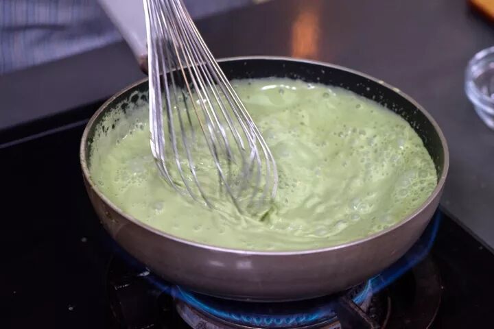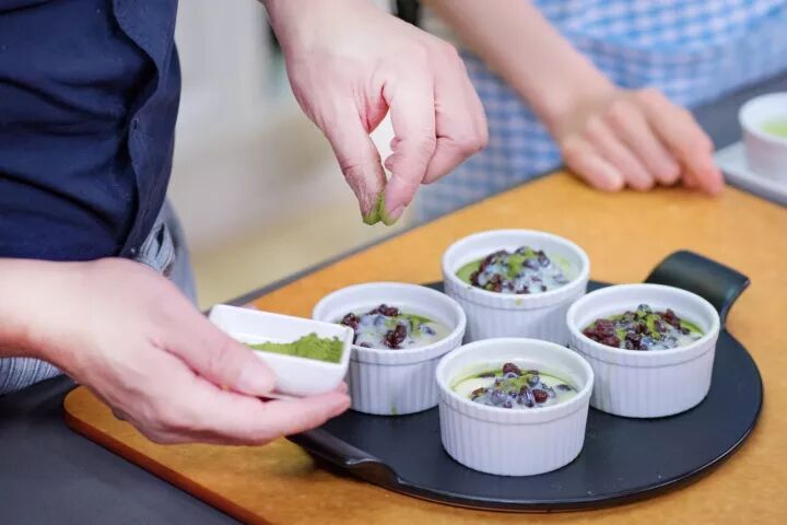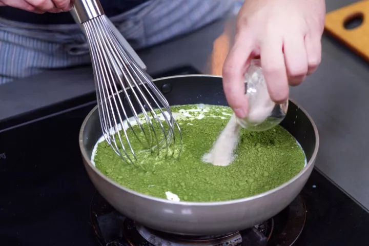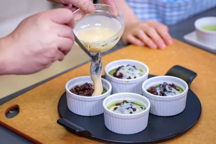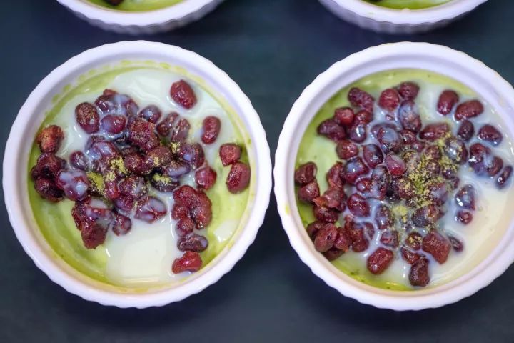 詹姆士的厨房 | 入门级的抹茶甜品:抹茶红豆奶酪 2023-02-24 责任编辑:詹姆士的厨房 514 在很多人的印象中,抹茶来源于日本。其实抹茶最初是在中国的隋唐就有了,后来传到了日本去并且发扬光大。今天我们就用抹茶来做一道甜品——抹茶红豆奶酪,相信你应该会喜欢!打蛋器、奶锅牛奶 400毫升白糖 60克炼乳 4匙鲜奶油 200毫升抹茶粉 5克蜜红豆 4匙吉利丁粉 15克【1】搅拌奶酪糊在奶锅中加入牛奶、鲜奶油、白糖、抹茶粉、吉利丁粉,并用打蛋器搅拌均匀。【2】熬煮奶酪糊开小火,继续搅拌熬煮。▼熬煮到有小气泡即可,奶酪或者乳制品不能熬煮到沸腾,不然会乳水分离。【3】盛杯将煮好的奶酪糊装入杯中。▼装到杯口的七分满即可。【4】冷藏将盛有奶酪糊的杯子放入冰箱中冷藏20分钟使其凝固。【5】加入炼乳、蜜红豆将冰箱中凝固好的抹茶奶酪取出,并加入蜜红豆和炼乳。▼如果自己煮蜜红豆,先把红豆煮熟了再加糖,注意煮的时候不要煮破皮。【6】撒抹茶粉在蜜红豆上撒上抹茶粉增强口感即可。我是抹茶控,吃到这样的抹茶红豆奶酪简直幸福得不得了~ 关键是没想到做法也非常的简单!超浓郁的抹茶粉配上甜甜的蜜红豆,完全不会觉得腻。而且炼乳的味道层层下渗到奶酪中,整个甜点真的是入口即化。零基础也能做出这样满分的甜点,周末我要好好犒劳一下自己啦!▼▼▼抹茶红豆奶酪:“我长这个样子!”本栏目内容由詹姆士的厨房节目制作 预览时标签不可点