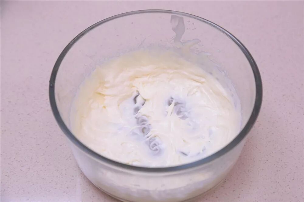 ⑨酱料完全凉透以后,打发淡奶油至7分发,有明显纹路